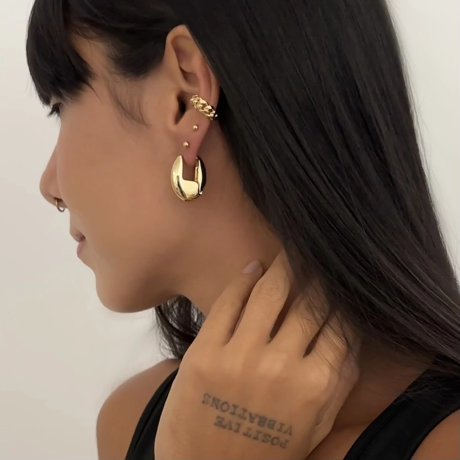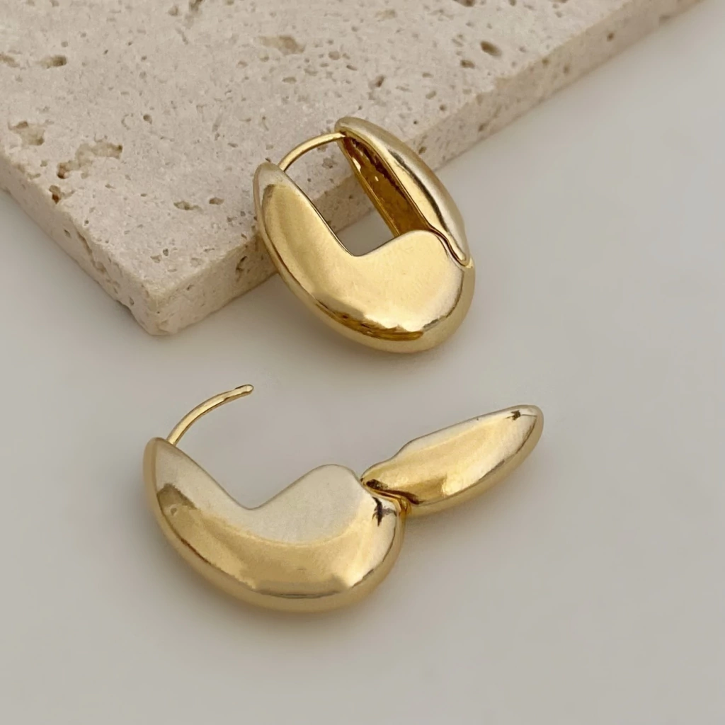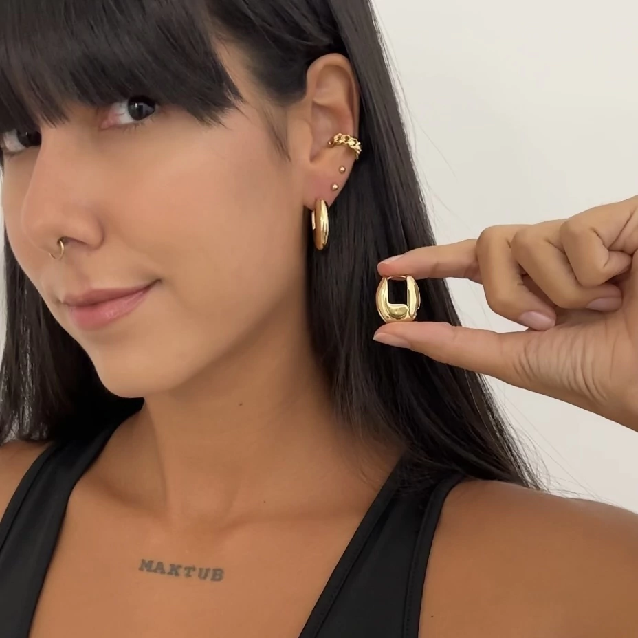 Com design orgânico e sofisticado, este brinco argola destaca-se pelas curvas suaves e acabamento espelhado que refletem elegância e modernidade. Banhado a ouro 18k, é uma semijoia hipoalergênica, livre de níquel e com verniz protect que garante brilho duradouro e resistência ao uso diário. Seu estilo contemporâneo adiciona um toque artístico a qualquer produção, do casual ao sofisticado.