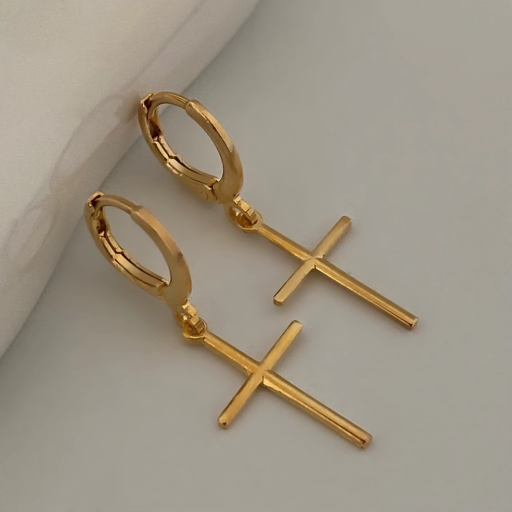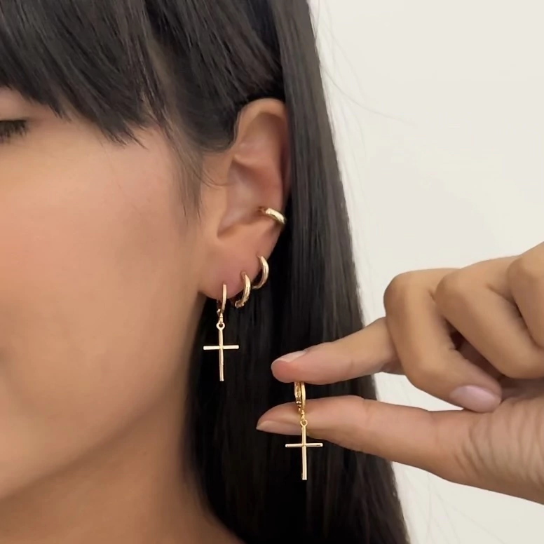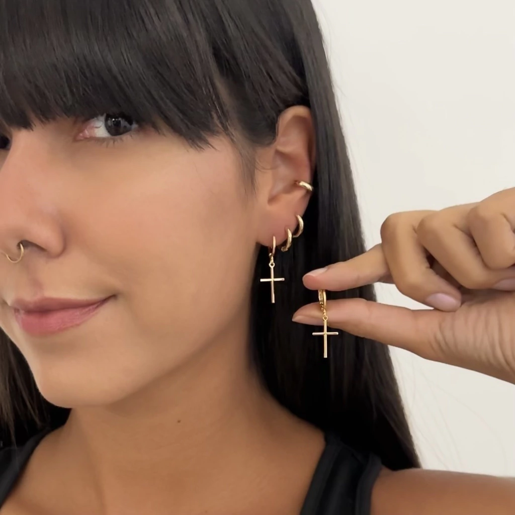 Com design elegante e significado marcante, este brinco traz uma argola delicada com pingente de cruz, unindo fé e estilo em uma só peça. Banhado a ouro 18k, apresenta acabamento polido que realça o brilho e sofisticação do acessório. Leve, hipoalergênico e livre de níquel, conta com verniz protect que garante durabilidade e resistência ao uso diário. Uma semijoia versátil, perfeita para compor mix de brincos ou destacar-se sozinha em produções elegantes.
